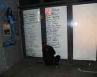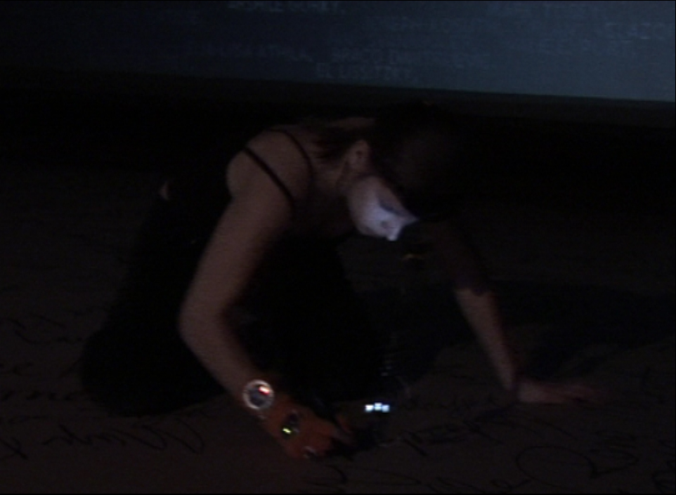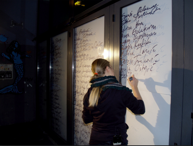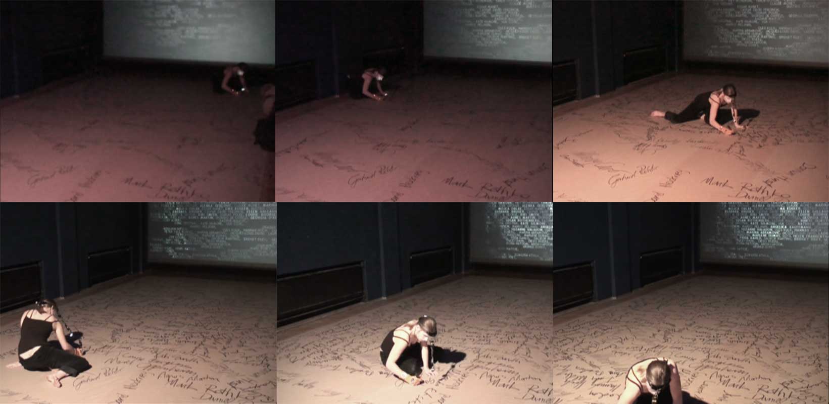 The names of 126 male artists were written on the gallery floor before the beginning of the performance. During the performance, I spoke out the names of the 126 female artists I learned, and at the same time wrote their names down on the floor, filling this way the empty gaps between other (male) artists. The performance also involved using a head-mounted wireless camera that constantly filmed my face, a projection that showed the image of my face true the perforation of the artist's names and dynamic lightning of the space that reacted to the speed and quantity of my writing. The technology was used to convey the idea about the issue of forgetfulness of art history and art theory.
