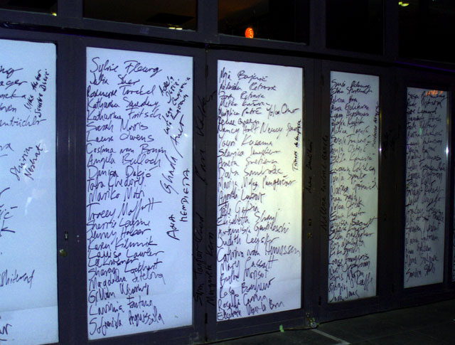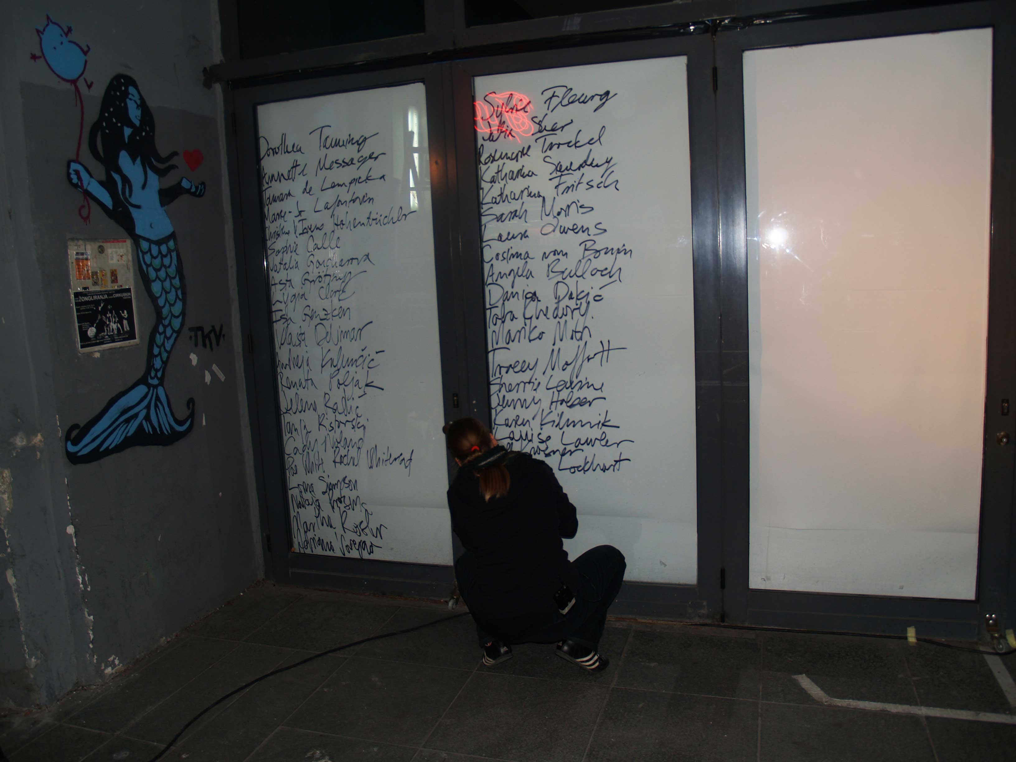 In this performance I pronounced the names of women and queer artists that I has previously learned by heart. At the same time I wrote them down on the floor of Metelkova with a permanent spray. All of the names were of artists who have presented their work at one of the Red Dawns festivals. With this action I wanted to permanently mark the Metelkova area, and create a monument both for the Red Dawns, in specific, and for feminist and queer art in general. Metelkova is also characterized by other spaces and organizations that deal with similar topics. This is why I symbolically linked them all with the line of names of the women artists in question. On one hand, the line marked Metelkova space as one of those places that carry a rich history of organizations, groups, and festivals, and which have been, and still are, dealing with the social status of women and other invisible groups, LGBTIQ in particular. The performance began at the Trg brez zgodovinskega spomina (Square with No Historical Memory) in front of Menza pri koritu.