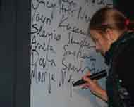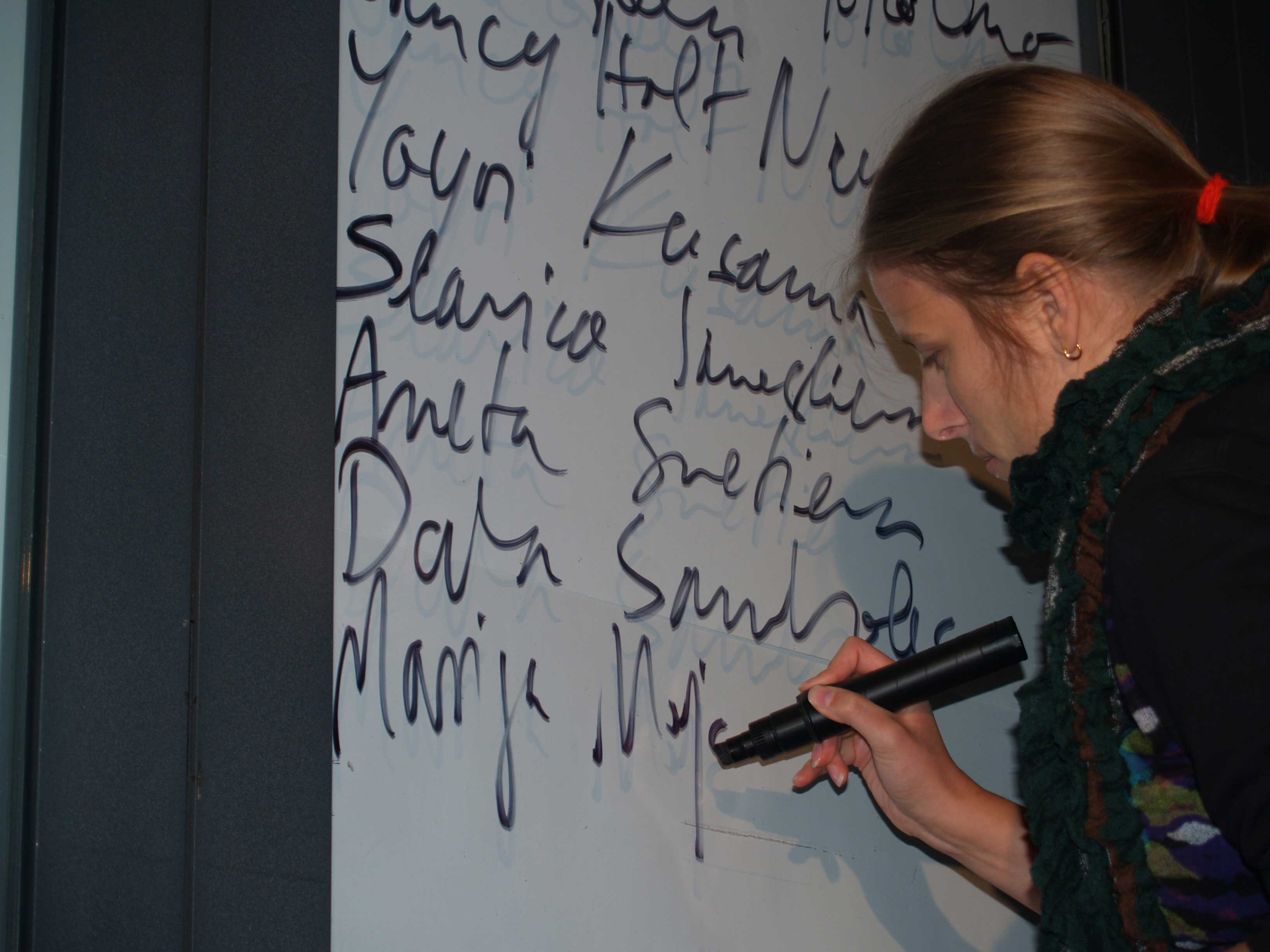 The performance Dear Ladies, Thank You was made in various formally and conceptually different variations. The variation in Kapelica Gallery in Ljubljana was the second one. The beginning of this performance started long before the actual event, when I wrote down on a piece of paper as many artists' names as I could think of. By doing this 'memory test' I came up with 126 male artists names and 34 female artists names. After learning that such a small percentage of the artists I remembered/knew, were women, I decided to make a statement about this problem by learning the same amount of female artist names by heart (as I knew of male artists) and make a representation of this act in a performance. I chose to act on the imbalanced state in the art world by radically shaping and balancing my own memory.