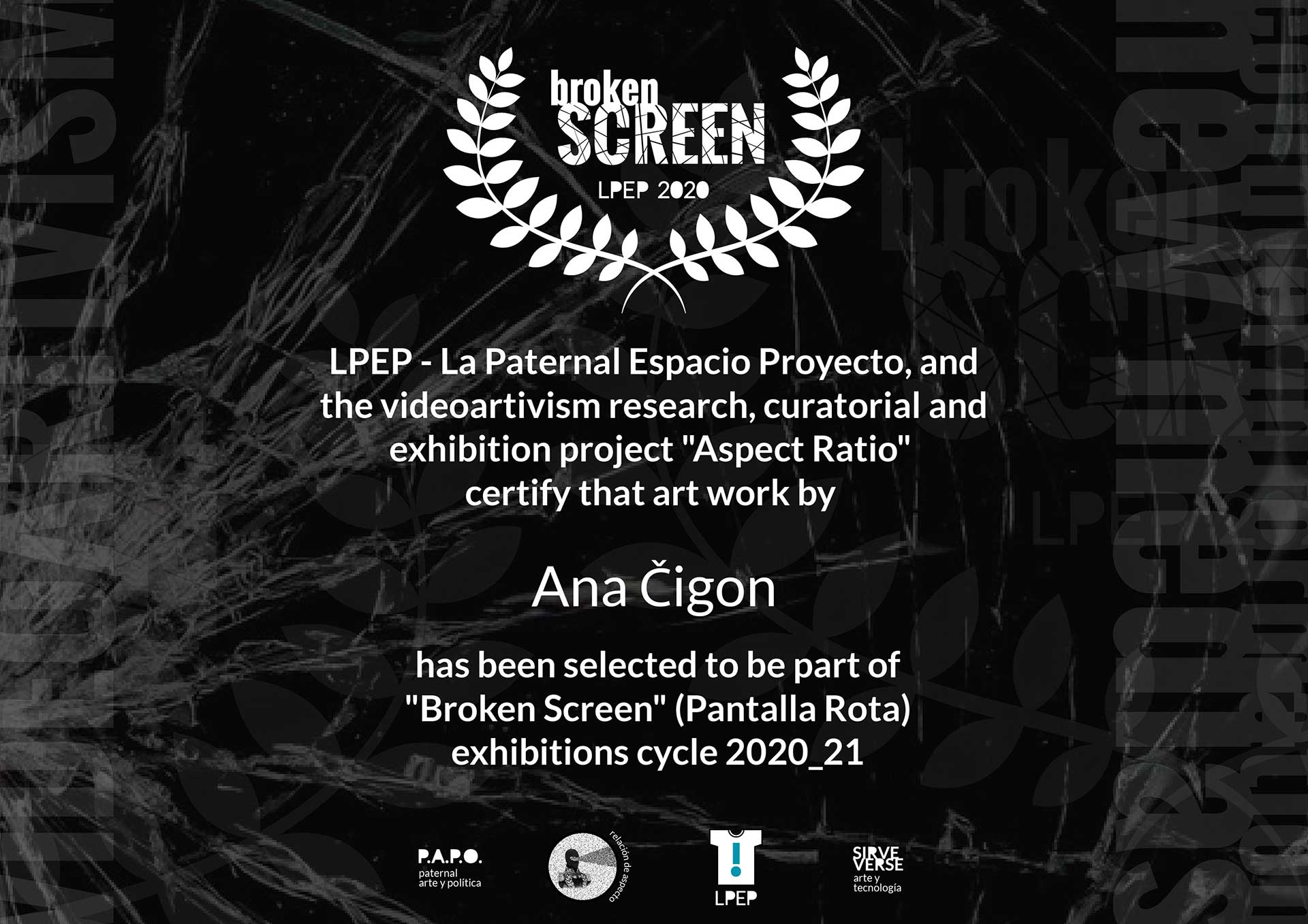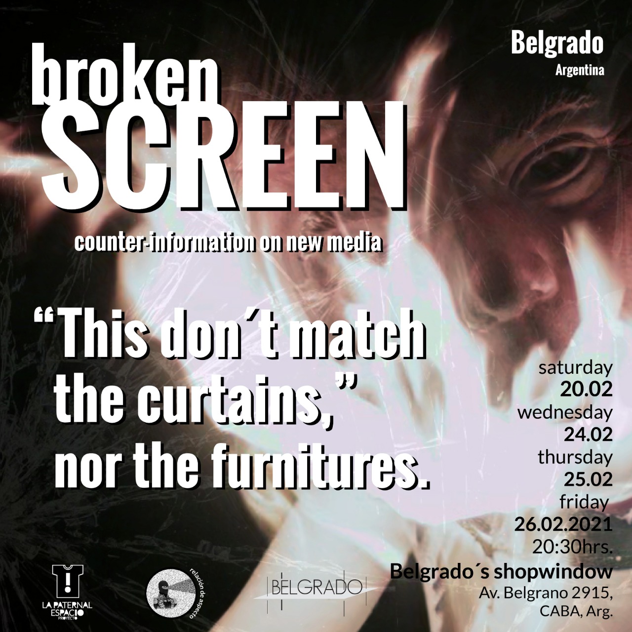 • Pantalla Rota / Broken Screen exhibitions: 3/12/2020, " The Treachery of Images", El Patio de las Artes IOPPS, San Juan; 19/12/2020, "Technocratic Apocalypse" (Ecological Transition and Conviviality), EL BLANCO Centro de Experimentaciones Artísticas, Buenos Aires city; 26/2/2021, "This don't match the curtains", Casa Belgrado, Buenos Aires city, Argentina